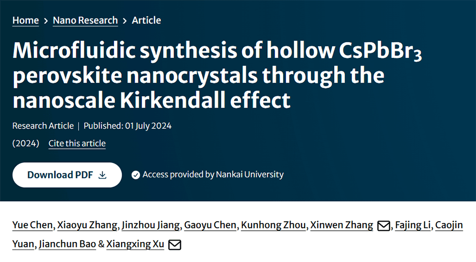 全无机金属卤化物钙钛矿纳米晶(NC),因其卓越的光电特性,在太阳能电池、发光二极管、光电探测器等众多领域显示出巨大的应用潜力。这些性能可以通过调控纳米级组成、表面、尺寸和形貌来实现。近期,南京师范大学徐翔星教授团队与南京邮电大学张新稳教授团队合作,采用先进的微流控合成技术,结合纳米级柯肯达尔(Kirkendall)效应,成功制备出空心的CsPbBr3钙钛矿纳米晶体。相关研究以“Microfluidic synthesis of hollow CsPbBr3 perovskite nanocrystals through the nanoscale Kirkendall effect”为题目发表于期刊《Nano Research》。