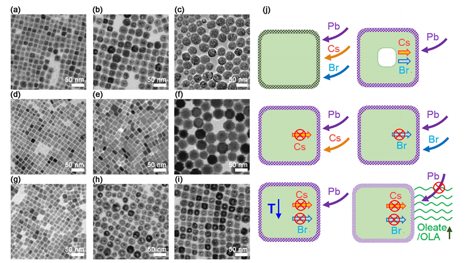 图3.(a)以10-300-0.36的高流速合成的实心CsPbBr3 NCs,(b)以10-300-0.12的低流速合成的空心CsPbBr3 NCs,(c)以8-320-0.24的高温合成的空心CsPbBr3 NCs的TEM图像,(d)ZnBr2在8-300-0.12的条件下将额外的Br-(×10倍)引入反应溶液,(e)通过2-300-0.12添加更多的Cs+(Pb:Cs=2:1),(f)向10-300-0.12添加额外的油酸铅(油酸铅:PbBr2=1.5:1),以及(g)更多的油胺(×2倍)加入到10-300-0.12中,(h)较少的油胺(0.75mL)与10-300-0.12一起使用,以及(i)在10-300-0.12中引入TOPO(TOPO:Br=2:1)。(j)控制CsPbBr3 NCs实心/空心形态的纳米级Kirkendall效应机制示意图。