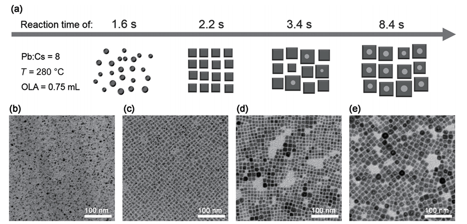 图2.(a)空心CsPbBr3 NCs的形成过程示意图。反应时间为1.6、2.2、3.4和8.4s的相应TEM图像分别如(b)、(c)、(d)和(e)所示。