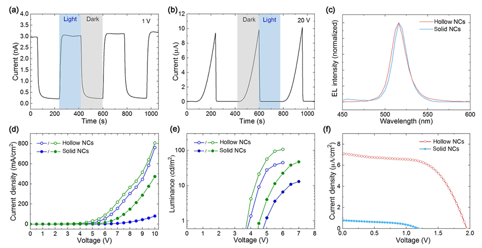 图5.偏置电压为(a)1V和(b)20V的典型PPC-NPC光电探测器的响应曲线,分别显示了在405nm光照下的PPC和NPC响应。(c)用实心和空心CsPbBr3 NCs制成的LED的EL光谱。电致发光LED的电压相关(d)电流密度和(e)亮度(颜色表示CsPbBr3 NC层厚度:蓝色约为40nm,绿色线约为80nm;线上的空心点和实心点分别代表空心和实心CsPbBr3 NC)。(f)基于空心和实心CsPbBr3 NCs(厚度约80nm)的LED的电流密度-电压特性。激发光来自工作功率为200mW/cm2的450nm激光器。
