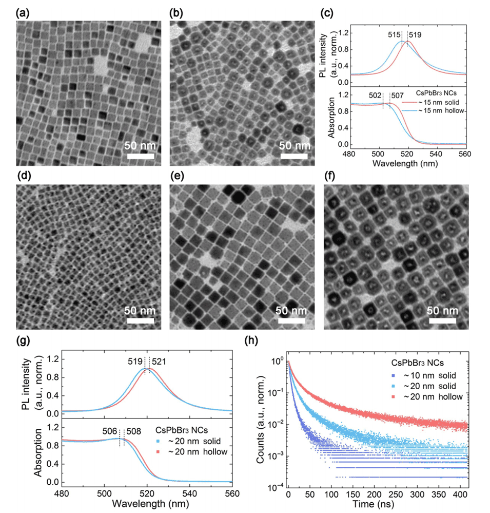 图4.约15nm的(a)实心CsPbBr3 NCs和(b)空心CsPbBr3 NCs的TEM图像,以及相应的(c)紫外-可见吸收光谱和PL光谱。(d)约10nm的实心CsPbBr3 NCs、(e)约20nm的实心CsPbBr3 NCs和(f)约20nm的空心CsPbBr3 NCs的TEM图像,以及相应的(g)紫外-可见吸收光谱和PL光谱以及(h)PL衰减曲线。