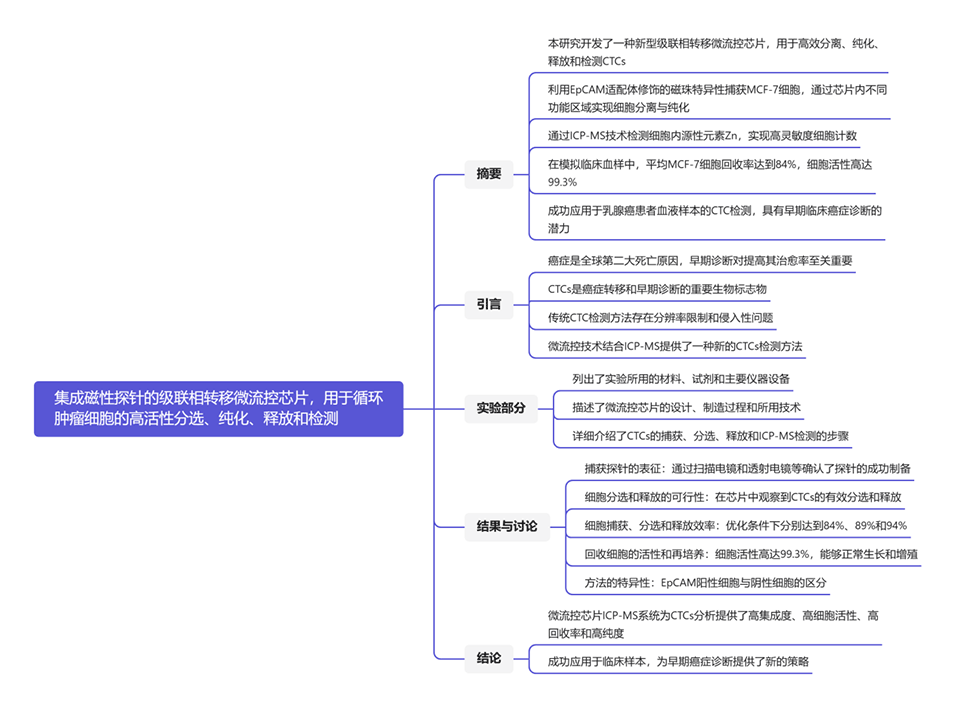 1、本研究开发了一种集成磁性探针和电感耦合等离子体质谱(ICP-MS)技术的新型级联相转移微流控芯片,用于高效分离、纯化、释放及检测血液中的循环肿瘤细胞(CTCs)。