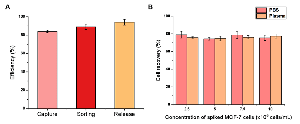图3.(A)最佳条件下PBS中MCF-7细胞的细胞捕获、分选和释放效率;和(B)在PBS和血浆中不同密度的MCF-7细胞的细胞回收。