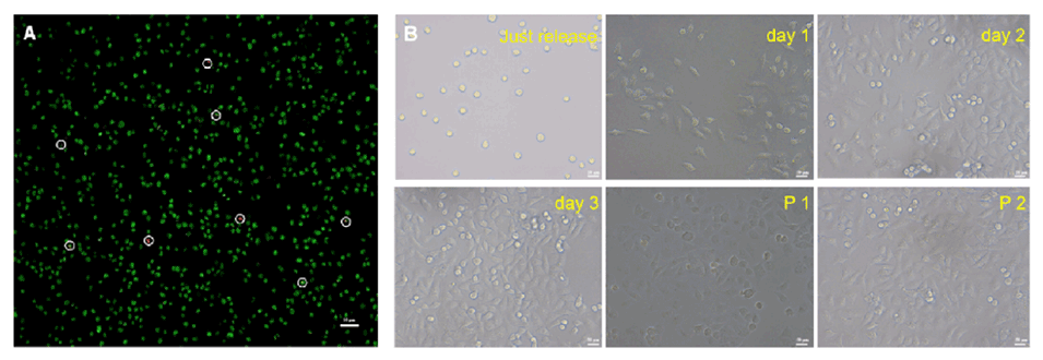 图4.(A)释放的MCF-7细胞经AO/EB染色后的荧光图像;(B)刚刚释放、再培养1、2和3天并到达第一代(P1,约6天)和第二代(P2,约10天)的MCF-8细胞的光学显微镜图像。