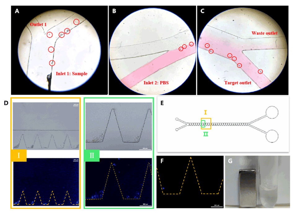 2、利用EpCAM适配体修饰的磁珠特异性捕获MCF-7细胞,通过芯片内不同功能区域实现细胞分离与纯化。