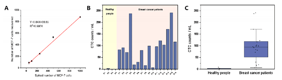 5、该方法成功应用于乳腺癌患者血液样品的CTC检测,为肿瘤早期诊断提供了新的策略。
