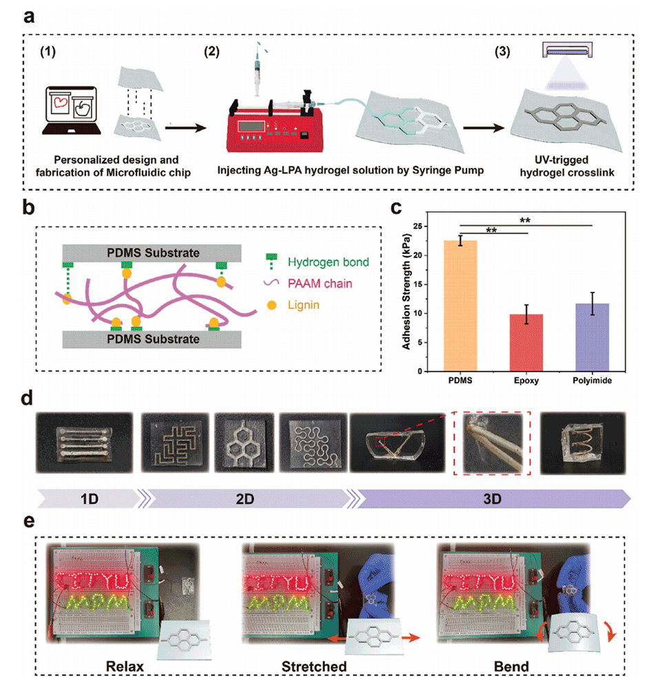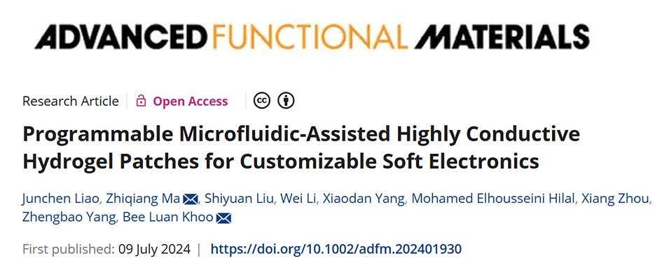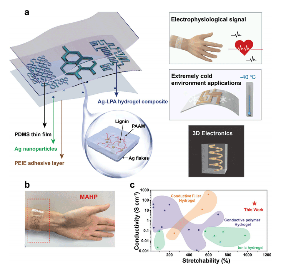 近期,香港城市大学邱美娈教授团队开发了一种具有高导电性和高拉伸性的自粘附银-木质素-聚丙烯酰胺(Ag-LPA)水凝胶复合材料,并利用微流控技术制造出可定制设计的软电子贴片(MAHPs),这些贴片在极寒环境下仍能保持稳定性能,为软电子设备在医疗健康监测、环境传感等多个领域的应用提供了创新解决方案。相关研究以“Programmable Microfluidic‐Assisted Highly Conductive Hydrogel Patches for Customizable Soft Electronics”为题目发表于期刊《Advanced Functional Materials》。