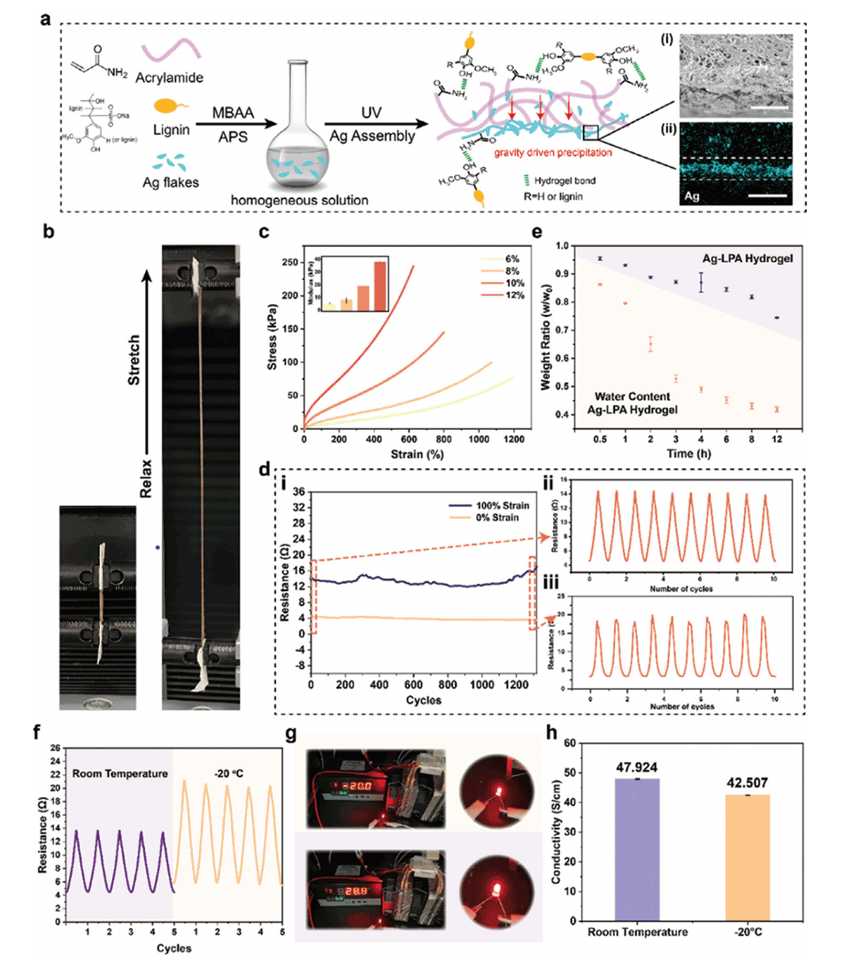 图2.Ag-LPA水凝胶复合材料的合成及其机电和电稳定性表征。