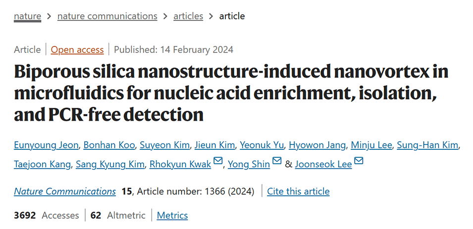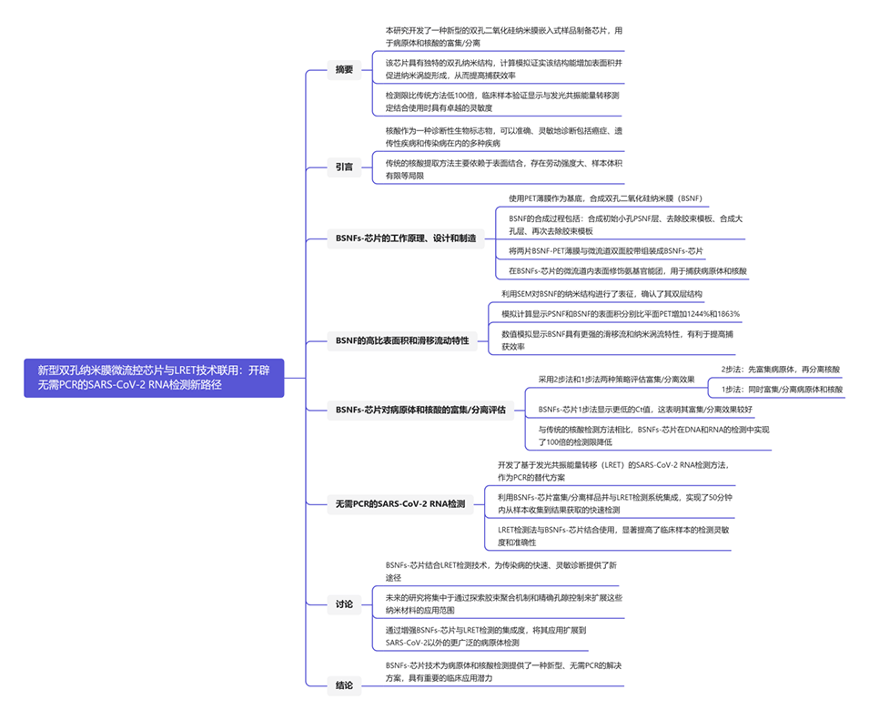 高效的病原体富集和核酸分离对于准确灵敏地诊断传染病,尤其是病原体水平较低的传染病至关重要。近期,有研究人员开发了一种新型的双孔二氧化硅纳米膜嵌入式微流控芯片(BSNFs-chip),该芯片通过独特的纳米结构增强病原体和核酸的富集/分离效率,并结合发光共振能量转移(LRET)技术,实现了对SARS-CoV-2 RNA的高灵敏度、无需聚合物链反应(PCR)的快速检测。相关研究以“Biporous silica nanostructure-induced nanovortex in microfluidics for nucleic acid enrichment, isolation, and PCR-free detection”为题目,发表在期刊《Nature Communications》上。