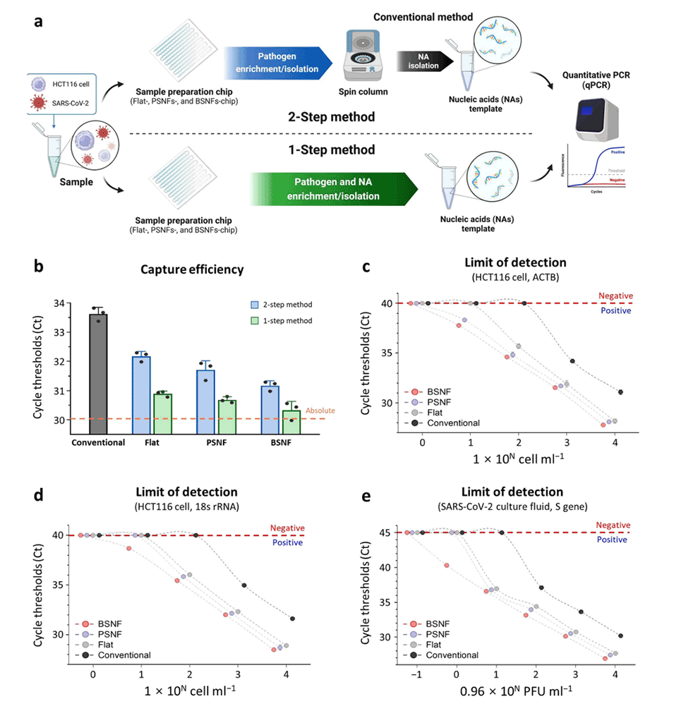 1、高灵敏度:BSNFs-芯片通过增加表面积和优化的流体动力学设计,显著提高了对病原体和核酸的捕获效率,实现了比传统方法低100倍的检测限。