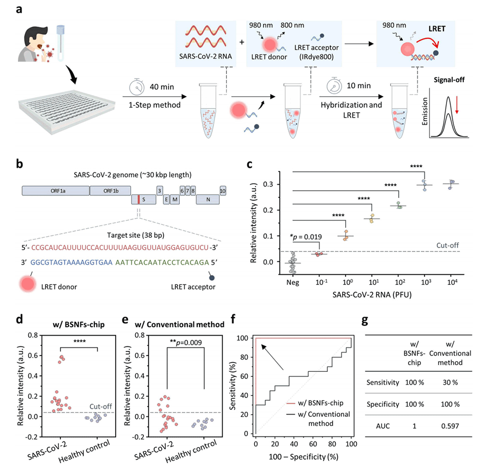 图5.对BSNFs-芯片提取的SARS-CoV-2 RNA进行无需PCR的高灵敏度检测。
