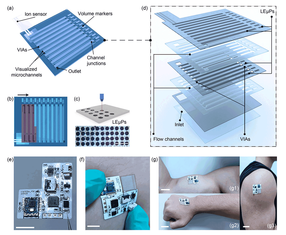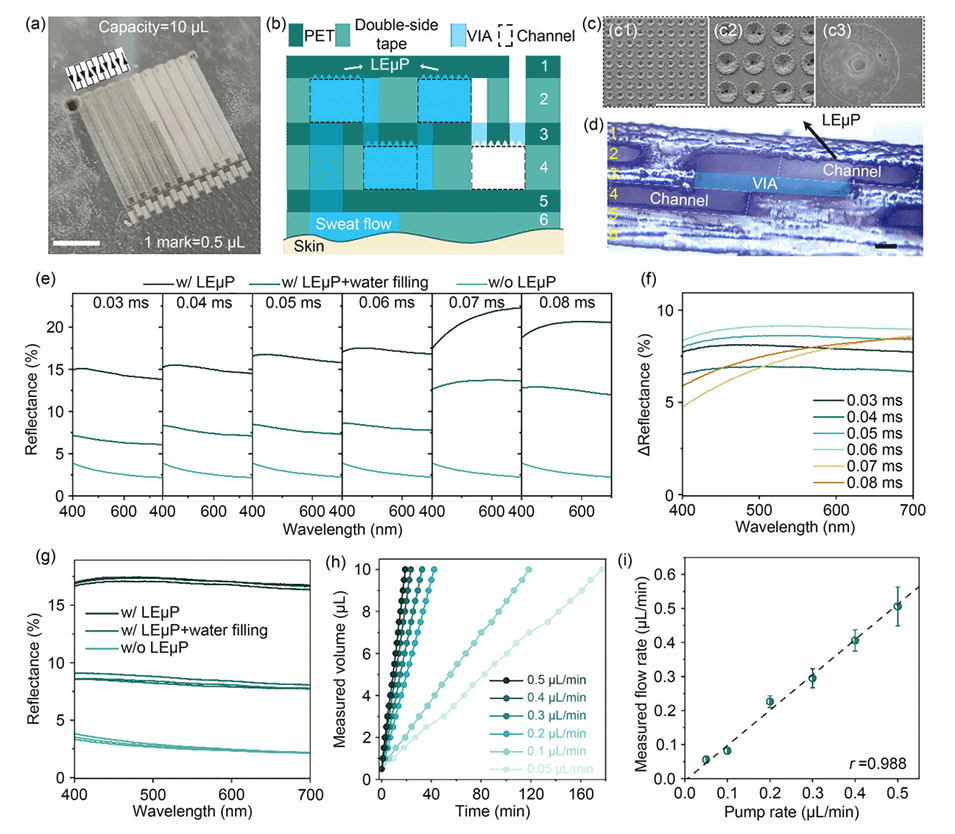 2、利用这些独特的光学特性,开发了一种全激光雕刻的微流控装置,能够通过肉眼观察来量化汗液流失。