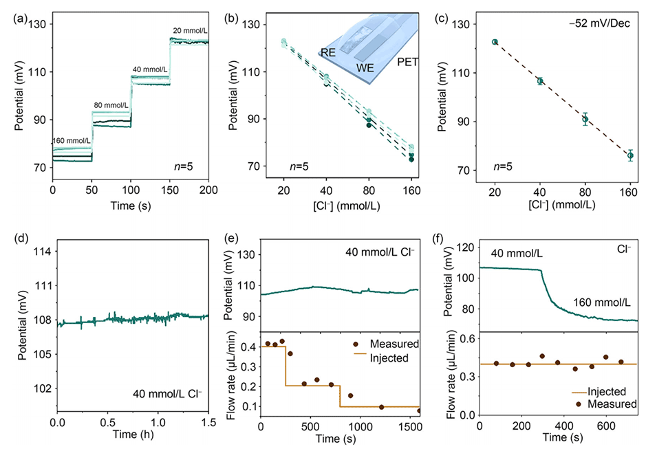 图3.电位氯化物传感器的特性和集成系统的无串扰双模测量。