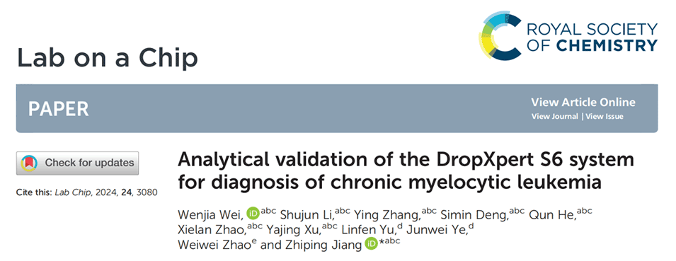 近期,中南大学湘雅医院姜志平团队开发了一种创新型集成数字液滴PCR平台,该平台利用尖端的微流控技术,将液滴生成、PCR扩增和液滴检测操作步骤集成到单个芯片上,加样后自动分析数据,满足了“样品进,结果出”的临床要求。相关研究以“Analytical validation of the DropXpert S6 system for diagnosis of chronic myelocytic leukemia”为题目,发表在期刊《Lab on a Chip》上。