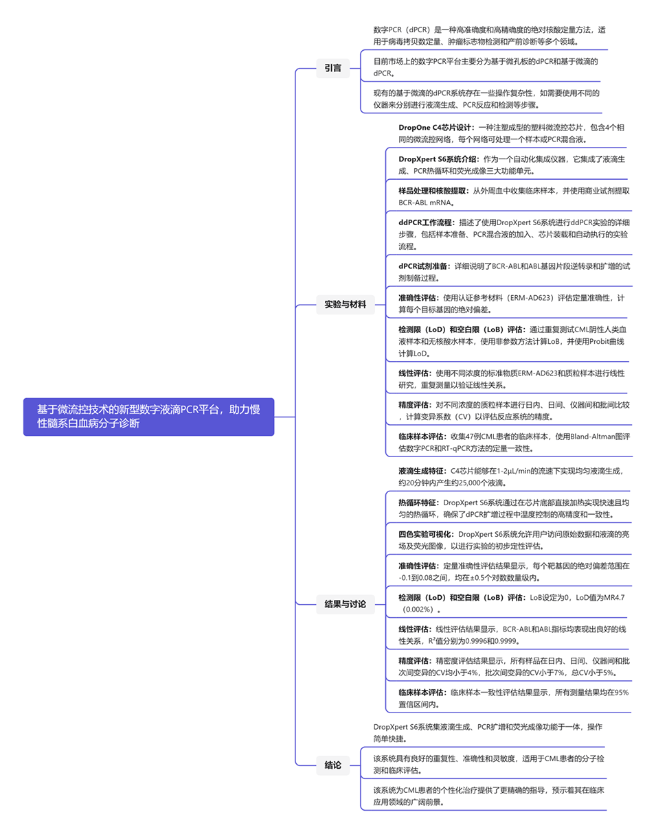 2、该研究首次验证了DropXpert S6系统的性能,从准确度、检测限、线性度和精密度四个方面重点评估了其在慢性髓系白血病(CML)诊断中的可靠性、重复性和一致性。