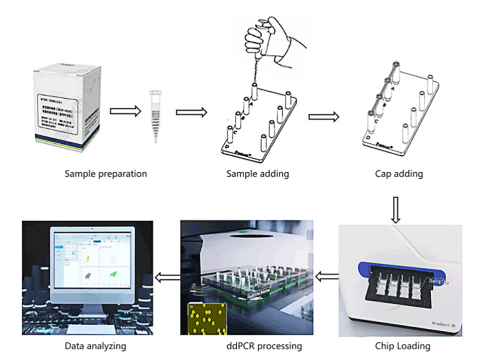 图4.DropXpert S6数字PCR工作流程:样品制备完成后,加入样品并用连接帽密封;然后将C4芯片放入DropXpert S6中,自动依次进行液滴生成、热循环、荧光成像采集和数据分析,最后使用软件进行数据分析。