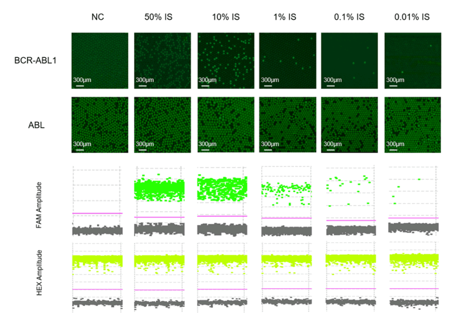 图11.原始液滴图和一维图显示了通过样品梯度稀释进行线性评估的结果。原始液滴图表示荧光通道上BCR-ABL1和ABL靶标的信号。作为内部参照的ABL基因保持稳定的拷贝数,而BCR-ABL1基因在无模板对照(NC)中没有扩增。在50%至0.01%的IS范围内,BCR-ABL1基因表现出极好的线性变异。