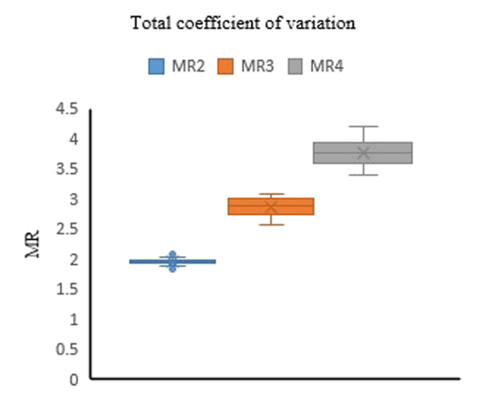图12.样品MR2、MR3和MR4分别有46、46和47个重复。这些样本的检测平均MR值分别为1.96、2.88和3.79。三个样本的变异系数分别为0.68%、4.47%和4.11%。
