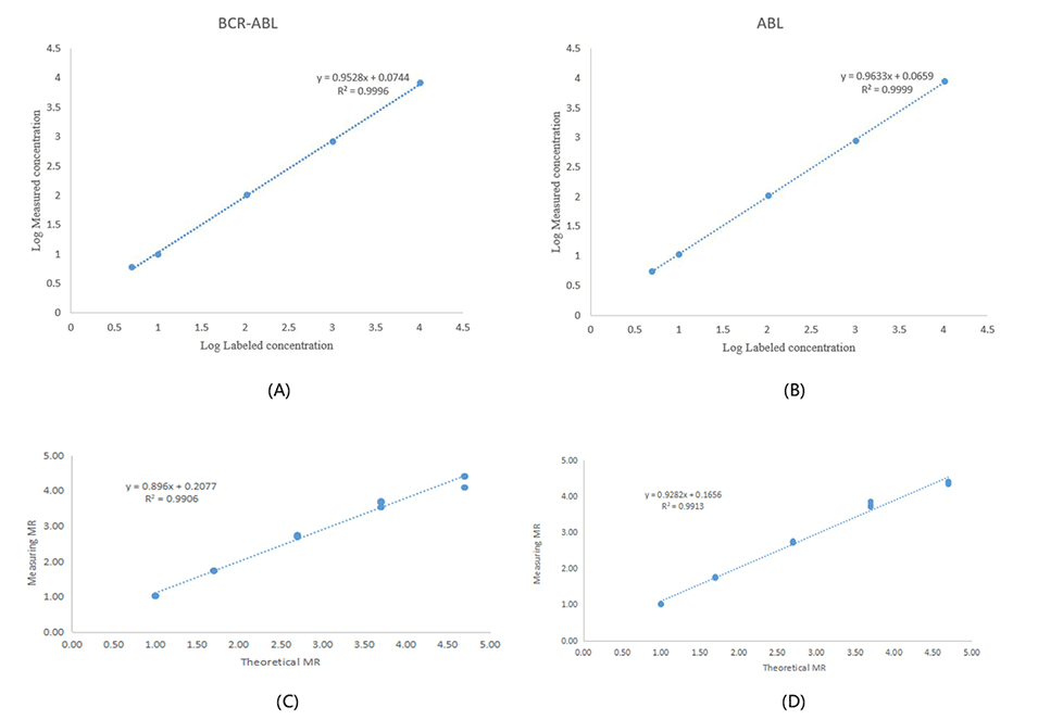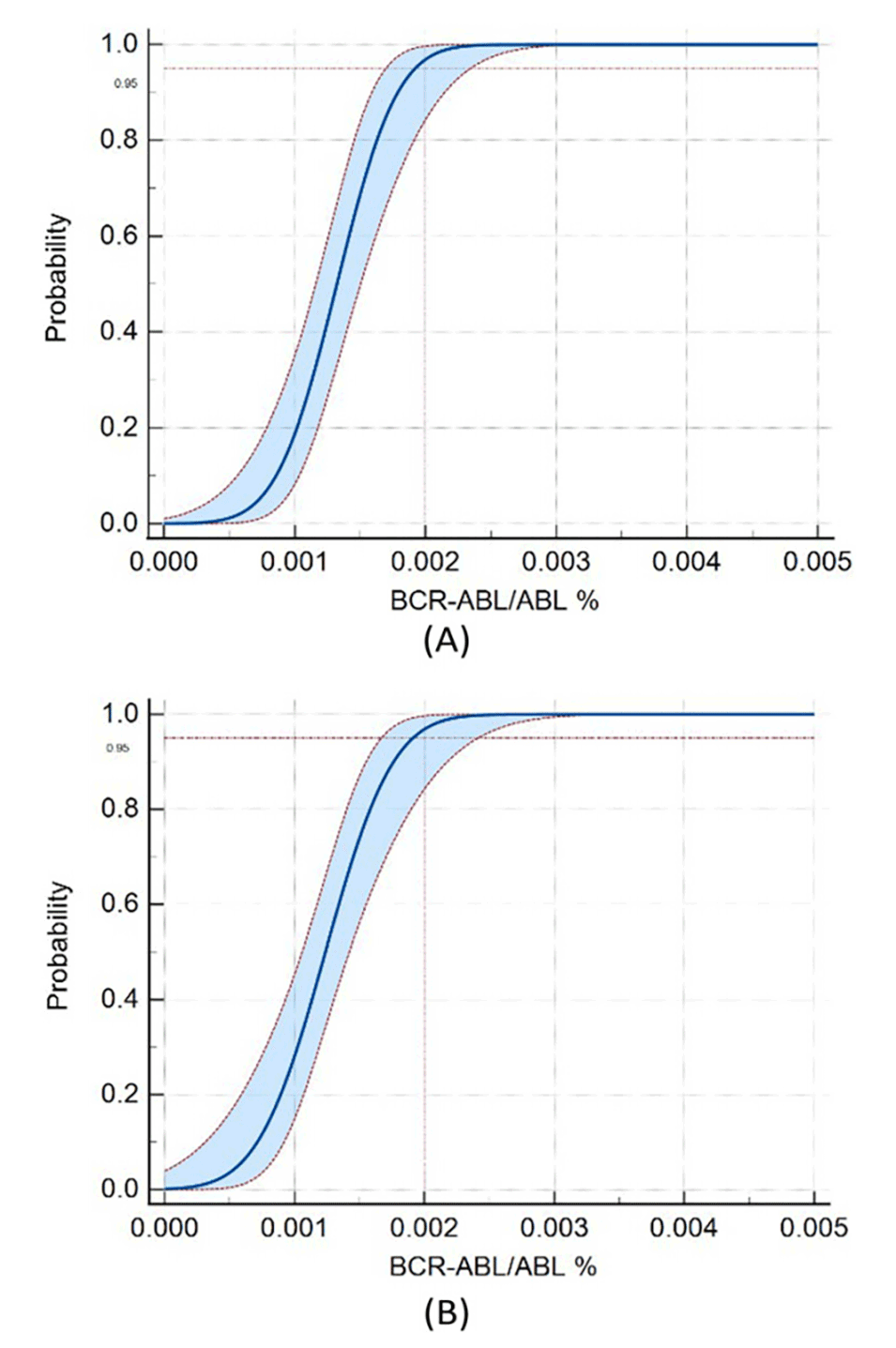 图9.(A)E14A2和ABL质粒的LoD研究。(B)E13A2和ABL质粒的LoD研究。质粒样品E14A2、E13A2和ZL-ABL的数字PCR定量在低浓度配置下进行,每种浓度有32个重复,根据质粒DNA联合研究的结果,该测定的LoD可确定为MR4.7(0.002%)。