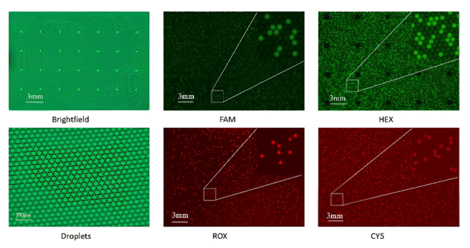 图7.C4芯片生成液滴的可视化。使用FAM、HEX、ROX和CY5四个采集通道进行PCR后成像。右上角放大了液滴形态,左下角显示了液滴晶体的放大部分。未扩增的液滴颜色较深,观察到扩增的液滴颜色较浅。
