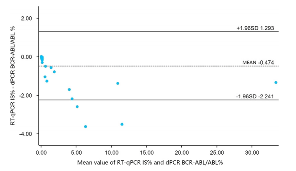 图13.使用qPCR和dPCR测量临床样本中的IS值,并使用Bland-Altman图评估两种技术的一致性。两种方法的平均偏差为-0.474,标准差为0.902,95%置信区间差为-2.241至1.293。