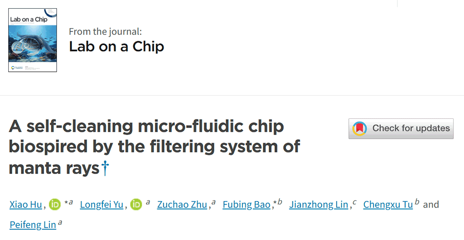 近期,浙江理工大学胡箫团队与中国计量大学包福兵教授团队合作,开发了一种具有仿生过滤叶结构的U形微流控芯片过滤器,其设计灵感源于蝠鲼的滤食机制。该芯片通过结合叶过滤和迪恩流实现了高吞吐量和高效率的颗粒过滤,并具有自清洁特性,为处理大量流体中的各种小颗粒提供了一种新型高效工具。相关研究以“A self-cleaning micro-fluidic chip biospired by the filtering system of manta rays”为题目发表于期刊《Lab on a Chip》。