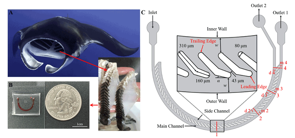 图1.(A)蝠鲼的摄食行为和鳃耙。(B)PDMS微流控装置照片(通道中注入了红墨水以便于观察)。比例尺为1cm。(C)生物模拟微流控结构的示意图。在插图中显示了主通道尺寸。