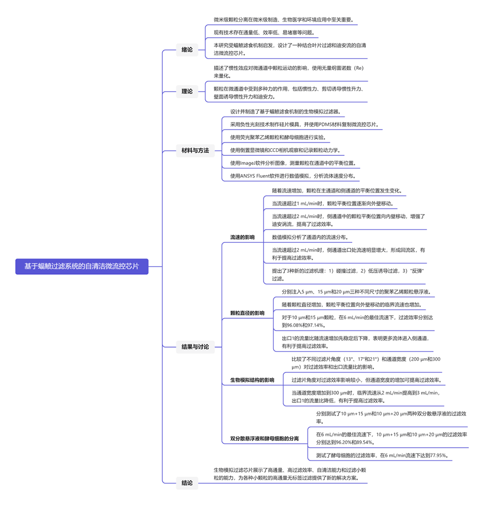 5、自清洁机制:设计具有自清洁能力的微流控芯片,可以减少颗粒在通道中的沉积和堵塞,从而在高通量条件下维持高过滤效率。模拟自然界中蝠鲼的自清洁机制,可以在微流控芯片中实现持续高效的过滤过程。