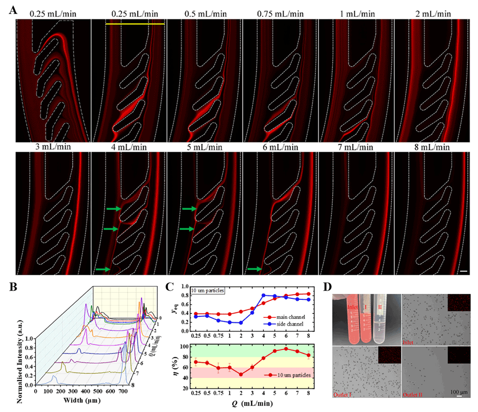 图2.(A)荧光流图像展示了10μm颗粒在不同流速下的轨迹。(B)黄线上10μm颗粒在不同流速下的归一化荧光强度分布。(C)两列显示了不同入口流速下10μm颗粒在主通道和侧通道中的无量纲横向平衡位置和过滤效率。(D)6mL/min时在入口和两个出口处采集的显微镜图像。