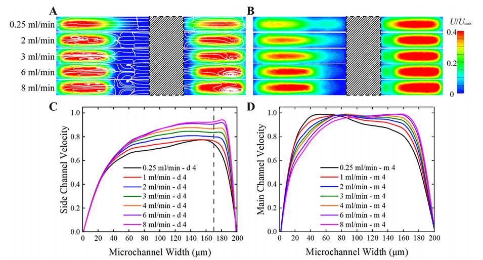 图3.沿(A)1和(B)4截面模拟速度等值线。白线代表流线。所有左侧图代表侧通道。颜色级别表示流速的大小。位置(C)d4和(D)m4的无量纲速度剖面。每个位置的无量纲速度用其在给定条件下的最大速度归一化。虚线表示速度快速变化的边界(w=177μm)。