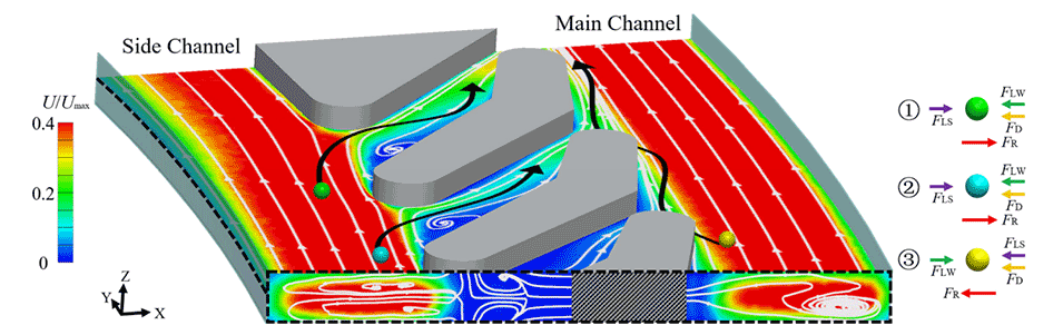 3、利用Dean流:Dean效应可以通过在微流控芯片通道中引入二次流来增强颗粒的侧向迁移,从而提高过滤效率。优化通道的曲率和形状,可以增强Dean效应,但同时也需要考虑其对通量的影响。