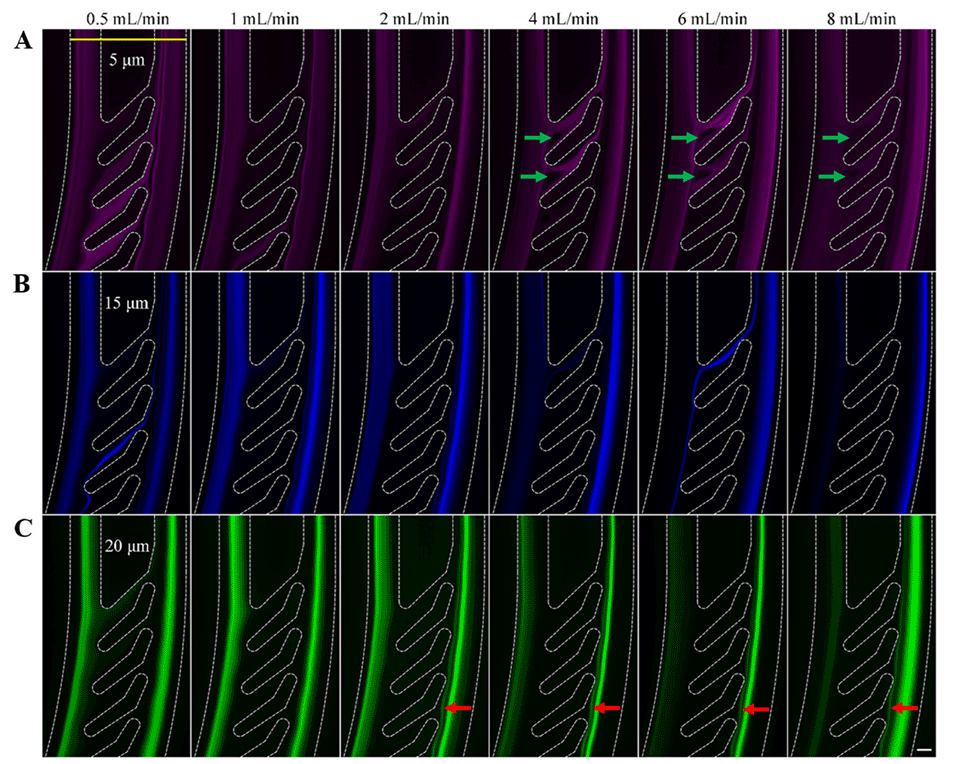 图5.荧光流图像显示了不同流速下(A)5、(B)15和(C)20μm颗粒在出口区域的轨迹。伪彩色的5、15和2020μm颗粒分别用红色、蓝色和绿色表示。图像中的白色虚线标记了通道壁。比例尺为100μm。绿色箭头指示过滤叶之间的回流区域位置。红色箭头指示“反弹”运动发生的位置。