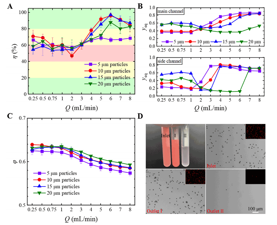 图6.(A)直径为5至20μm的颗粒的过滤效率。(B)主通道和侧通道的无量纲平衡位置与入口流速的函数关系。(C)直径为5至20μm的颗粒在出口1处的流速比。(D)当Q=6mL/min时,在入口和两个出口处采集的15μm颗粒的显微图像。