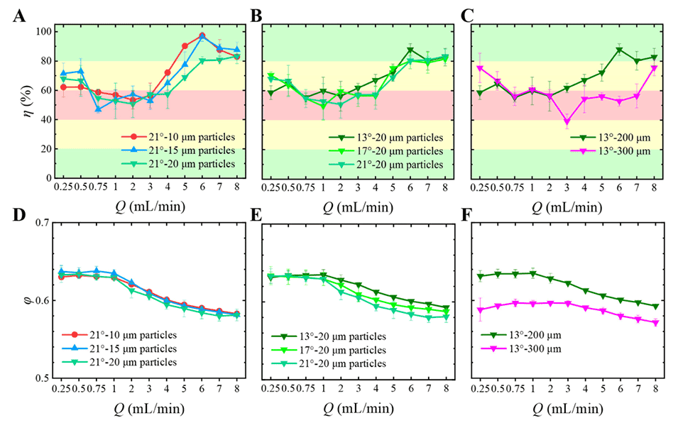 图8.(A)当过滤叶角度为21°时,直径为10至20μm的颗粒的过滤效率。(B)20μm颗粒在13°、17°和21°过滤叶角度下的过滤效率比较图表。(C)20μm颗粒在200和300μm通道宽度下的过滤效率比较图表。(D)直径为10至20μm的颗粒在21°过滤叶角度下的流速比。(E)当过滤叶角度为13°、17°和21°时,20μm颗粒的流速比比较图。(F)20μm颗粒在200和300μm通道宽度下的流速比比较图。