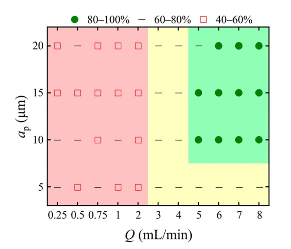 图7.比较了基于粒径(ap)和入口流量的过滤效率的实验和数值模拟。为了便于比较,实验颗粒过滤效率被分为低(40-60%)、中(60-80%)和高(80-100%)效率,分别用红色框、黑色虚线和绿色圆圈表示。