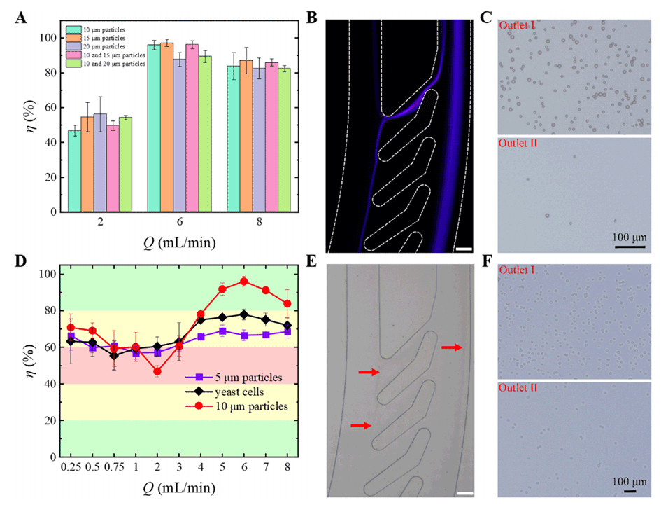 图10.(A)单分散和双分散实验中过滤效率的比较。(B)在6mL/min时实验1(10和15μm颗粒)出口区域的荧光流图像。图像中的白色虚线标记通道壁。比例尺为100μm。(C)在6mL/min时实验1(10和15μm颗粒)两个出口处采集的显微镜图像。(D)酵母细胞与单分散悬浮液(5和10μm颗粒)的过滤效率比较。(E)6mL/min时出口区域的酵母细胞的明场图像。红色箭头指示酵母细胞的流线。比例尺为100μm。(F)6mL/min时在两个出口处采集的酵母细胞的显微镜图像。