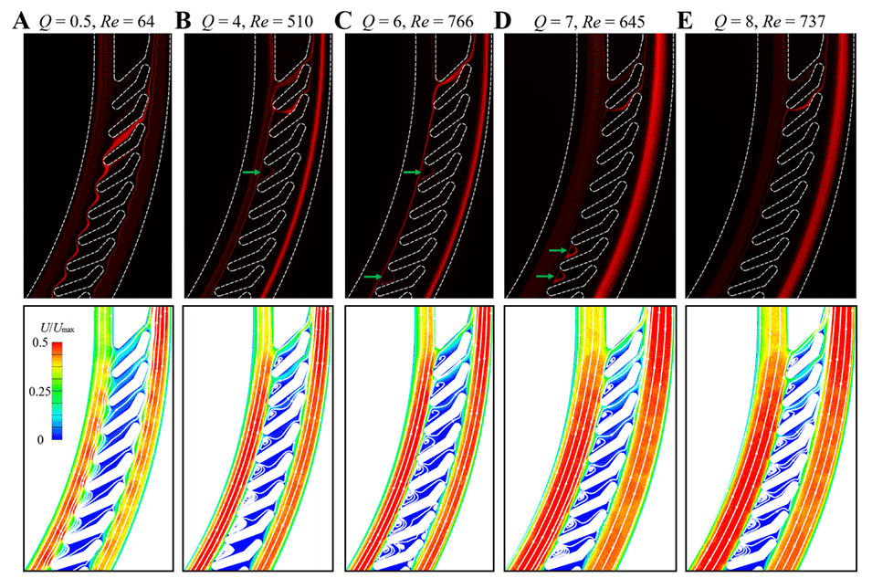 图9.(A-C)荧光流图像(w=200μm)显示了入口流速为0.5、4和6mL/min时10μm颗粒的颗粒轨迹。(D和E)荧光流图像(w=300μm)显示了入口流速为7和8mL/min时10μm颗粒的颗粒轨迹。这些图像中的白色虚线标记了通道壁。绿色箭头指示过滤叶之间的涡流位置。第一行显示了实验荧光流图像。第二行显示了在相应条件下Z=0横截面上的数值流场速度和流线分布。