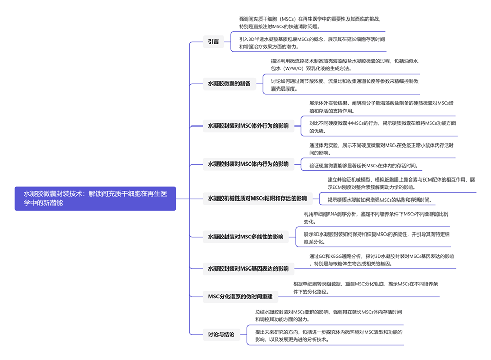 间充质干细胞(MSCs)在再生医学中是一种重要的选择,但它们在维持细胞系和存活率方面面临挑战,因此其治疗潜力仍有待验证。由于直接注射的MSCs会被宿主免疫系统迅速清除,将活细胞封装在3D半透水凝胶基质中可以延长其在体内的滞留时间,这在提高治疗效果方面显示出巨大潜力。然而,水凝胶封装对MSC的不同亚群的影响尚不完全清楚。