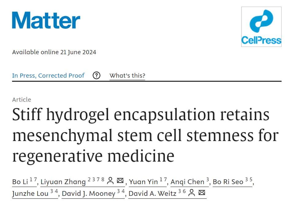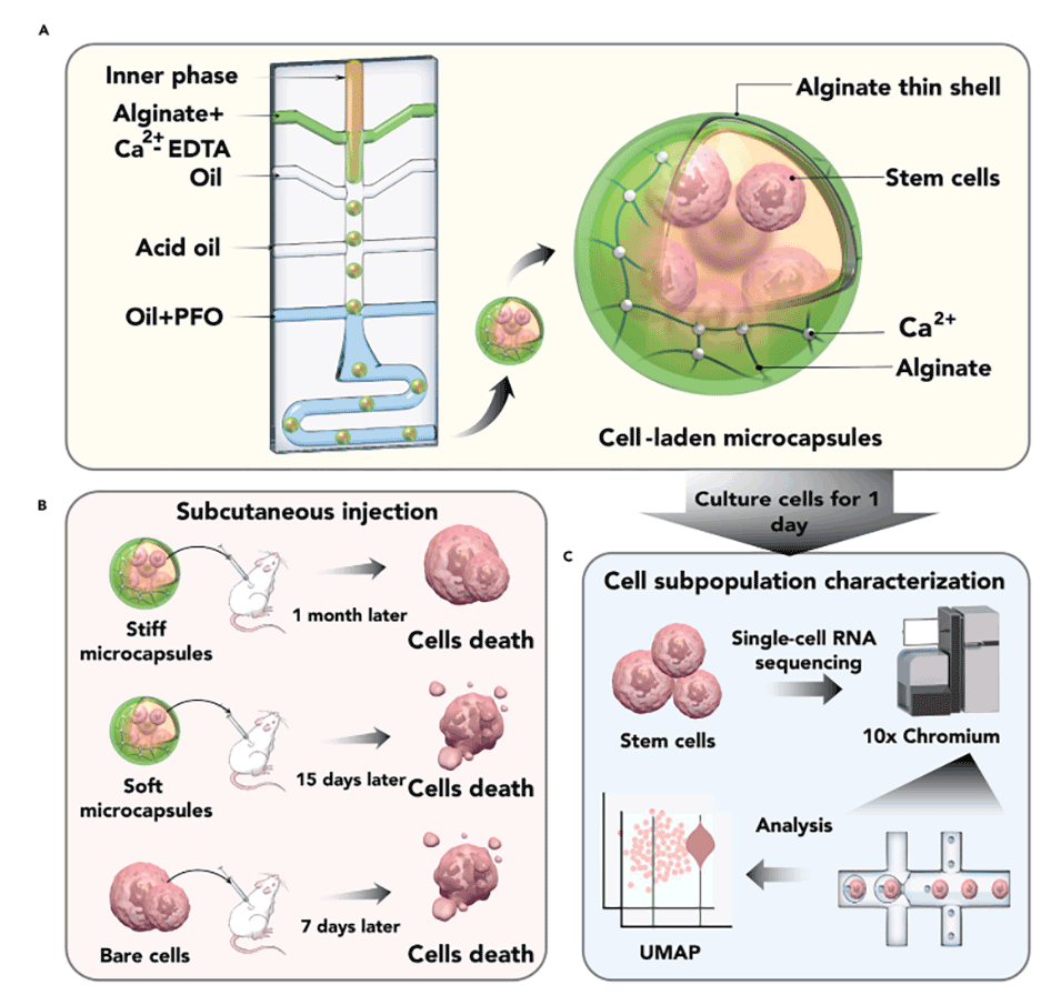 近期,中国石油大学(华东)张丽媛教授、哈佛大学David A. Weitz院士等人使用液滴微流控技术制造了薄壳层海藻酸盐水凝胶微囊,通过调整海藻酸盐分子量来控制壳层的机械特性。相关研究以“Stiff hydrogel encapsulation retains mesenchymal stem cell stemness for regenerative medicine”为题目,发表在期刊《Matter》上。