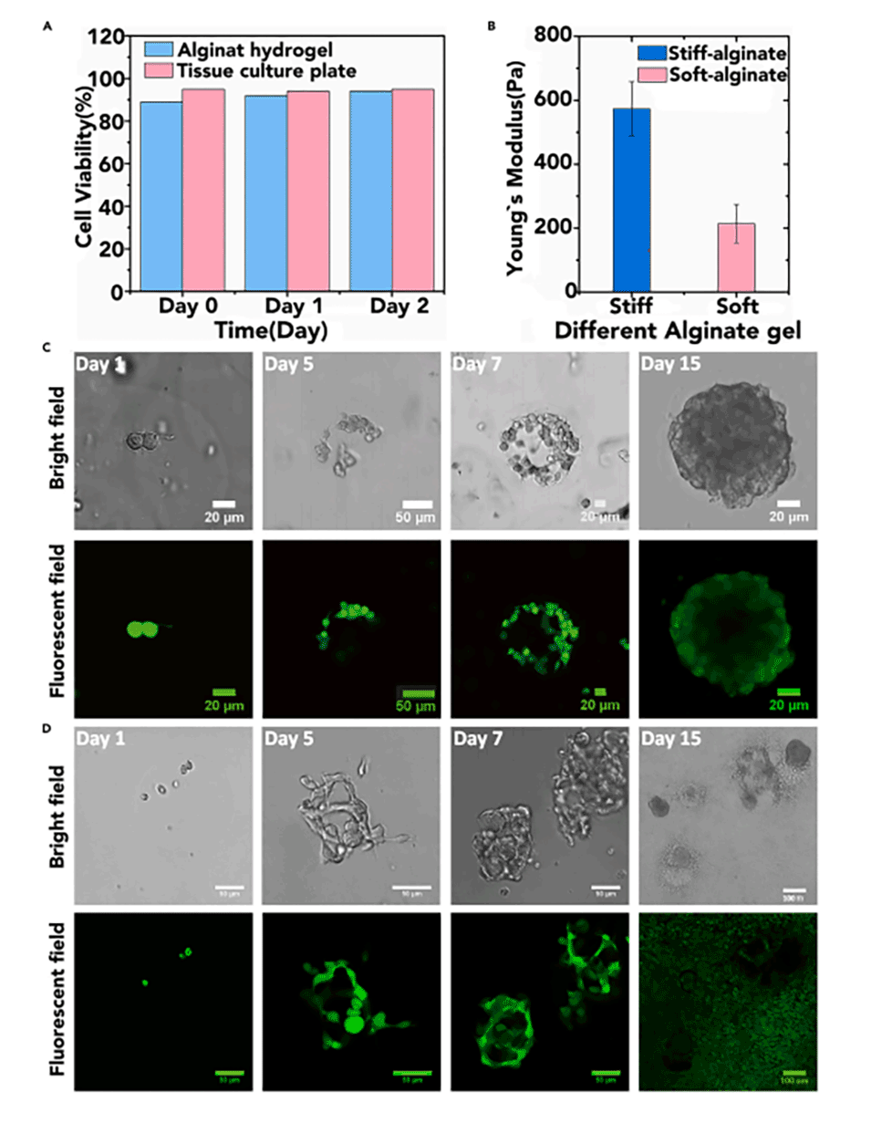 图3.海藻酸盐微胶囊的机械性能对体外干细胞行为的影响