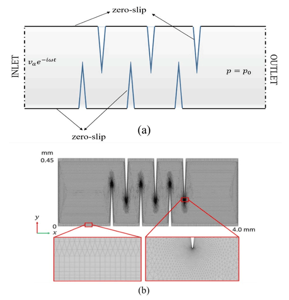 图5.(a)2D锐边微通道计算域的边界条件示意图和(b)所获得的计算网格的示例。