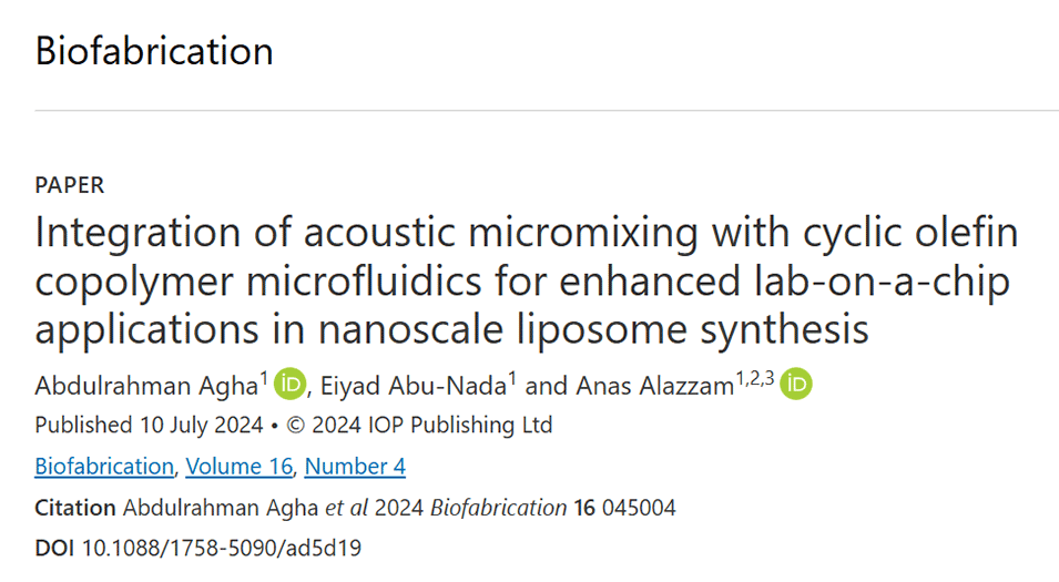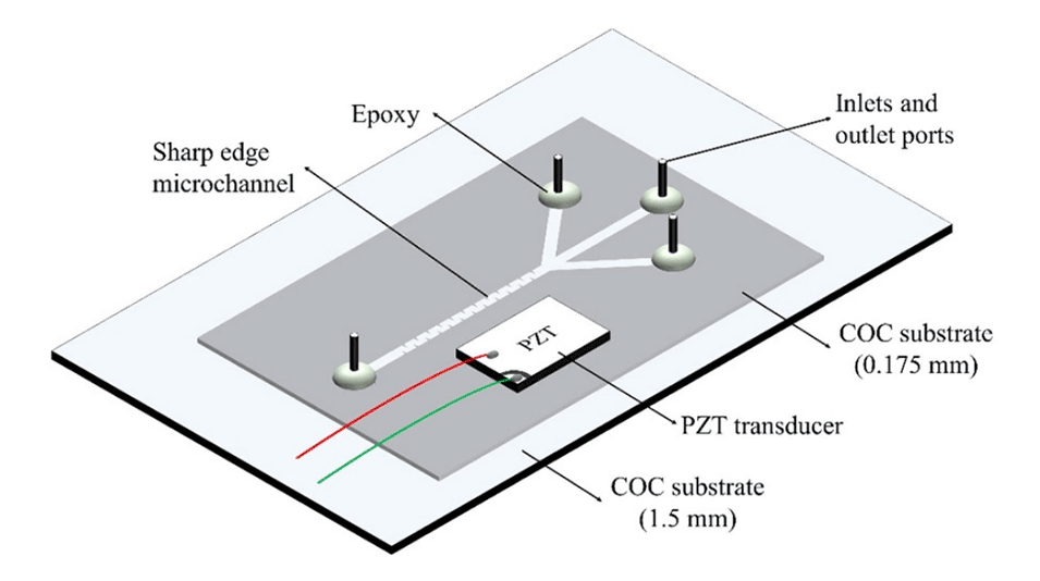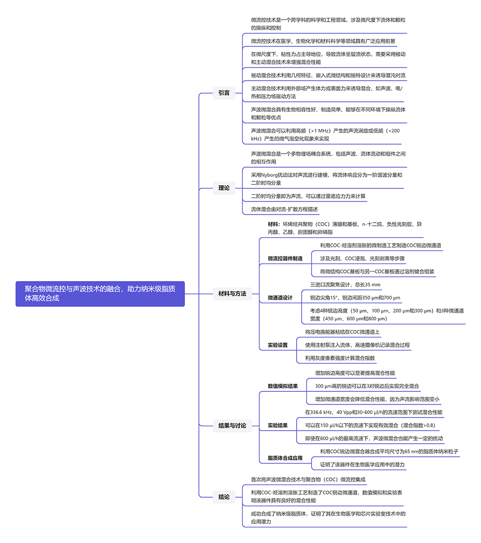 近期,一项创新研究首次将聚合物微流控技术与声波微混合技术相结合,通过振荡锐边结构在微通道中实现了流体的高效混合,并成功应用于纳米级脂质体的合成。相关研究以“Integration of acoustic micromixing with cyclic olefin copolymer microfluidics for enhanced lab-on-a-chip applications in nanoscale liposome synthesis”为题目,发表在期刊《Biofabrication》上。