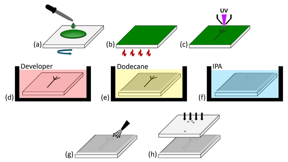 图2.基于溶胀的COC锐边微通道制造示意图。