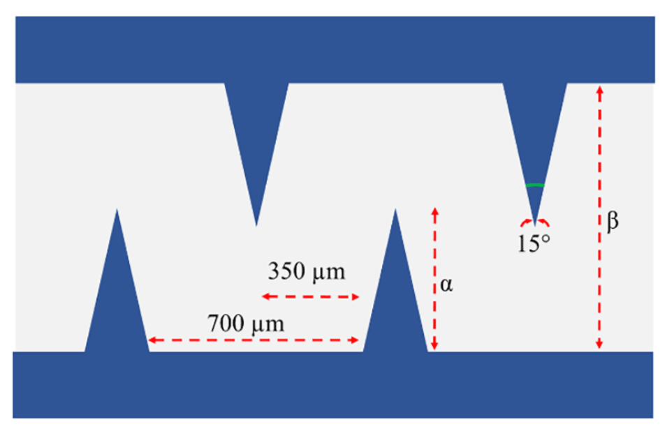 图3.所考虑的锐边微通道的几何尺寸,包括尖端角度(15°)、锐边间距(350µm和700µm)、锐边高度(α)和微通道宽度(β)。