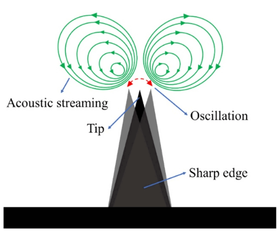 图1.微通道中锐边结构产生的声流。在压电换能器的驱动下,锐边会发生振荡,并在尖端产生一对反向旋转的涡流。