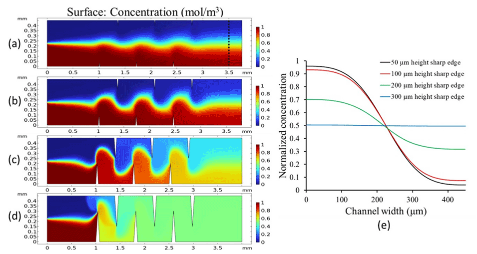 图6.当尖端角度为15°、vin=1500µm/s、频率为5.5kHz、微通道宽度为450µm时,不同锐边高度下的浓度分布。锐边高度:(a)50µm,(b)100µm,以及(c)200µm和(d)300µm。(e)随着锐边高度的增加,在x=3.5mm处沿微通道宽度的归一化浓度曲线。