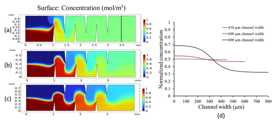 图7.当尖端角度为15°、vin=1500µm/s、频率为5.5kHz、锐边高度为300µm时,不同微通道宽度下的浓度分布。微通道宽度:(a)450µm,(b)600µm,和(c)800µm。(d)随着微通道宽度的增加,在x=3.5mm处沿微通道宽度的归一化浓度图。