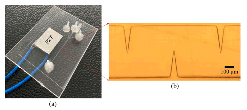 图8.(a)装配好的COC锐边微通道,带有入口和出口以及压电传感器。(b)制造的COC锐边的俯视图。