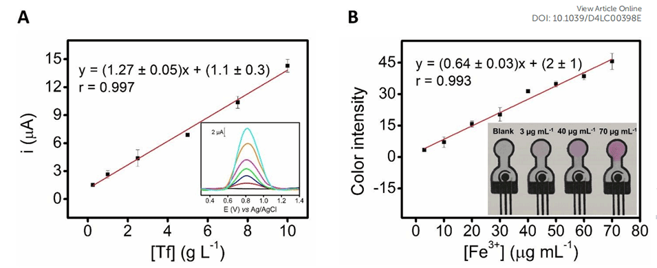 图2.(A)电流强度与Tf浓度的校准图。插图:对应于pH3.0(黑线)、0.25g/L Tf(红线)、1g/L Tf(蓝线)、2.5g/L Tf(绿线)、5g/L Tf(紫线)、7.5g/L Tf(橙线)和10g/L Tf(蓝线)的30μL 0.2M BR缓冲液的伏安图。SWV参数:起始电位+0.3V,终止电压+1.4V,频率200Hz,振幅0.05V,阶跃电位0.005V(背景信号线性化)(n=3)。(B)颜色强度与Fe3+浓度的校准图。插图:用于校准的dual µPAD的图像。实验条件:浓度为3μg/mL至70μg/mL的30μL Fe3+标准溶液在pH3.0的0.2M BR缓冲液中反应2分钟(n=3)。