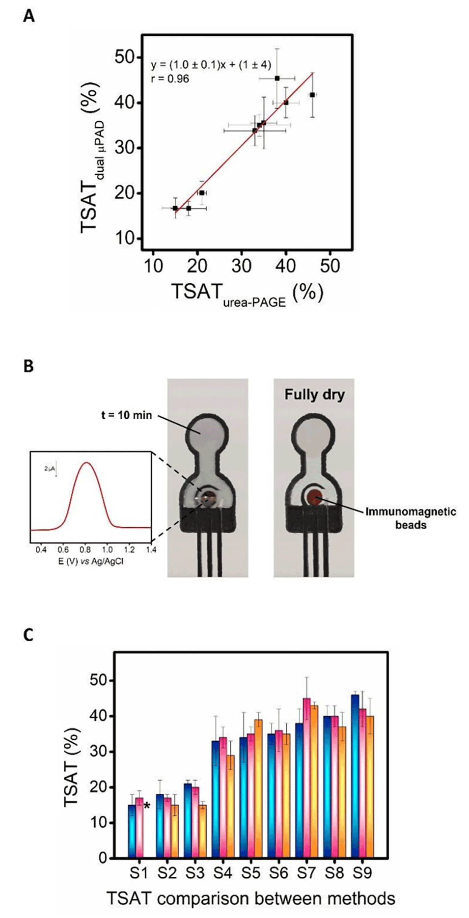图3.(A)dual µPAD和尿素-PAGE获得的TSAT值之间的相关性(n=3)。(B)对样本S5进行TSAT评估的dual µPAD的图像,其中包含两个参数:方波伏安法用于检测转铁蛋白含量(电化学检测)和10分钟时Fe2+-铁锌络合物的形成(比色检测)(左),以及同一dual µPAD完全干燥后的图像,观察到MB完全保留在工作电极上(棕色圆圈)(右)。(C)尿素-PAGE法(蓝色条)、基于dual µPAD的方法(粉色条)和之前报道的基于比色PAD(橙色条)的方法在TSAT分析中的比较。*比色PAD不适用于样本S1。